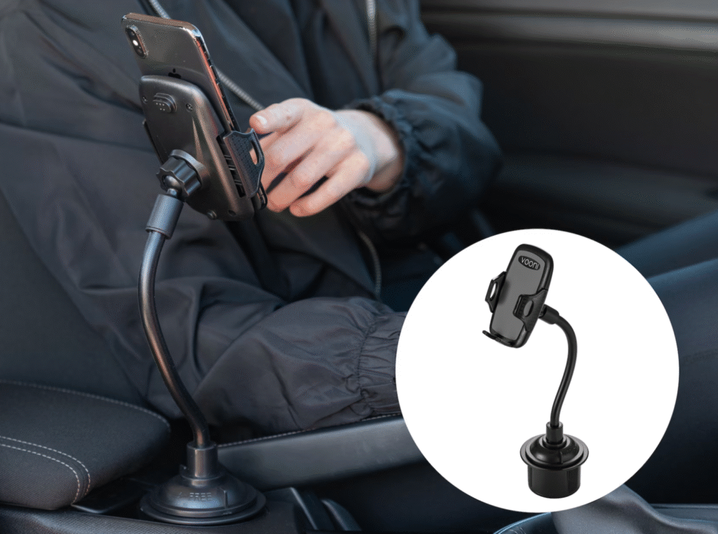 Denne mobilholderen sitter trygt i koppholderen, slik at du slipper både sugekopper på vinduet og telefoner som sklir under setet i svingene.