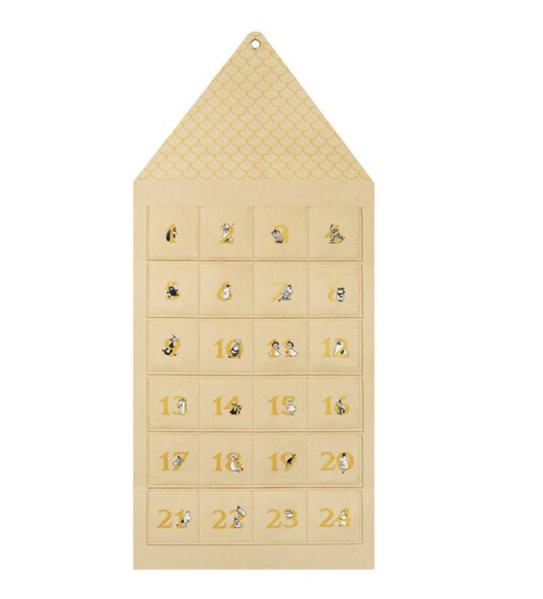Adventskalenderen «Mummihuset» i beige er en dekorativ og gjenbrukbar julekalender med 24 små lommer fylt med Mummimagi.